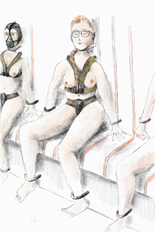 Naja, zum ersten Mal wurde ich noch als Novizin bestraft, gleich an meinem dritten Tag in der Ersterziehungseinrichtung. Da wurde man in einem Gestell fixiert und bekam ein Strafgeschirr an, das man dann die ganze Nacht im Schlafsitz tragen musste. Das war schmerzhaft, aber das Schlimmste war für mich, dass mir alle anderen Novizinnen dabei zugesehen haben, wie ich beim Anlegen des Geschirrs völlig hilflos, an Händen und Füßen festgeschnallt, aufgespannt hängen musste.