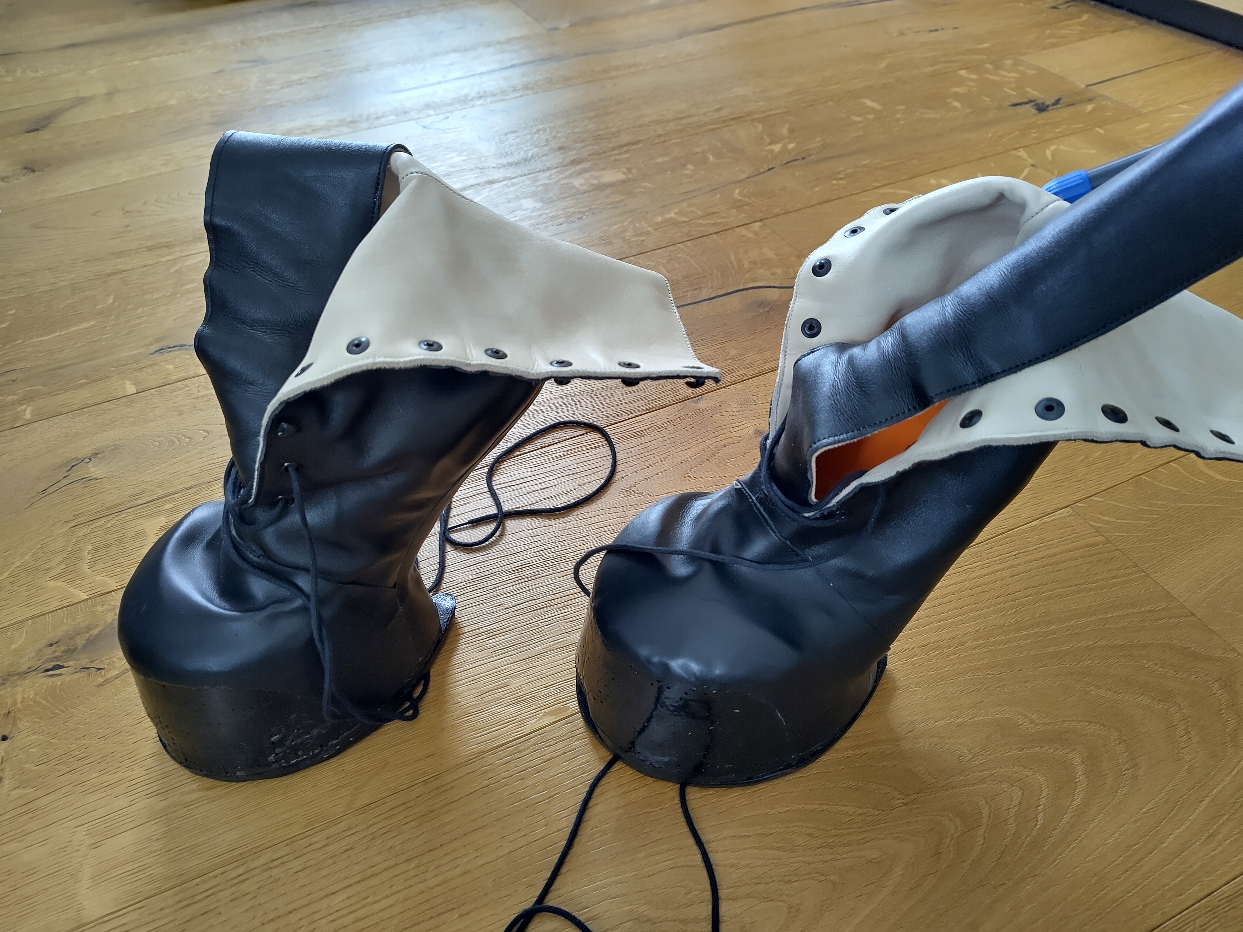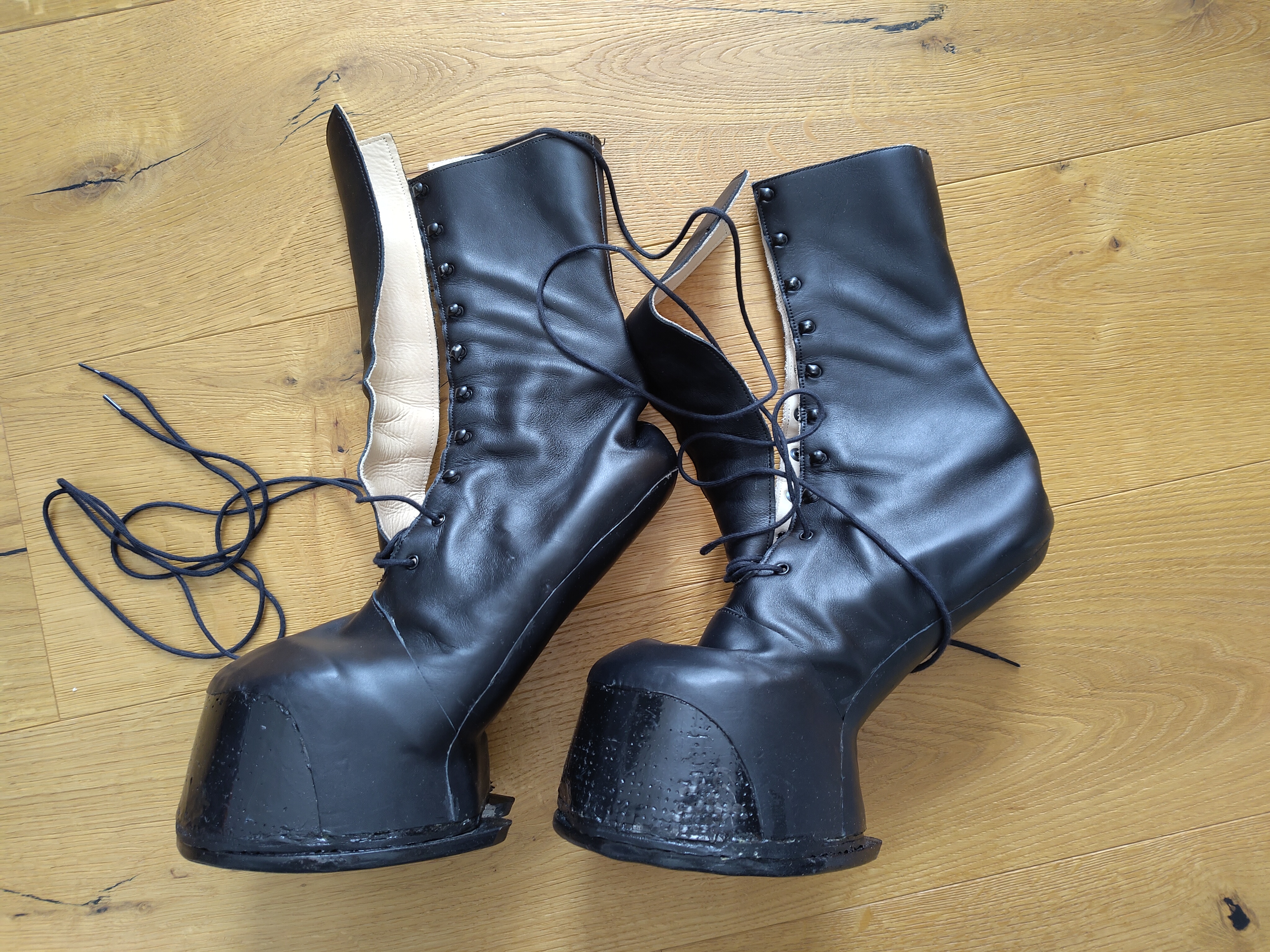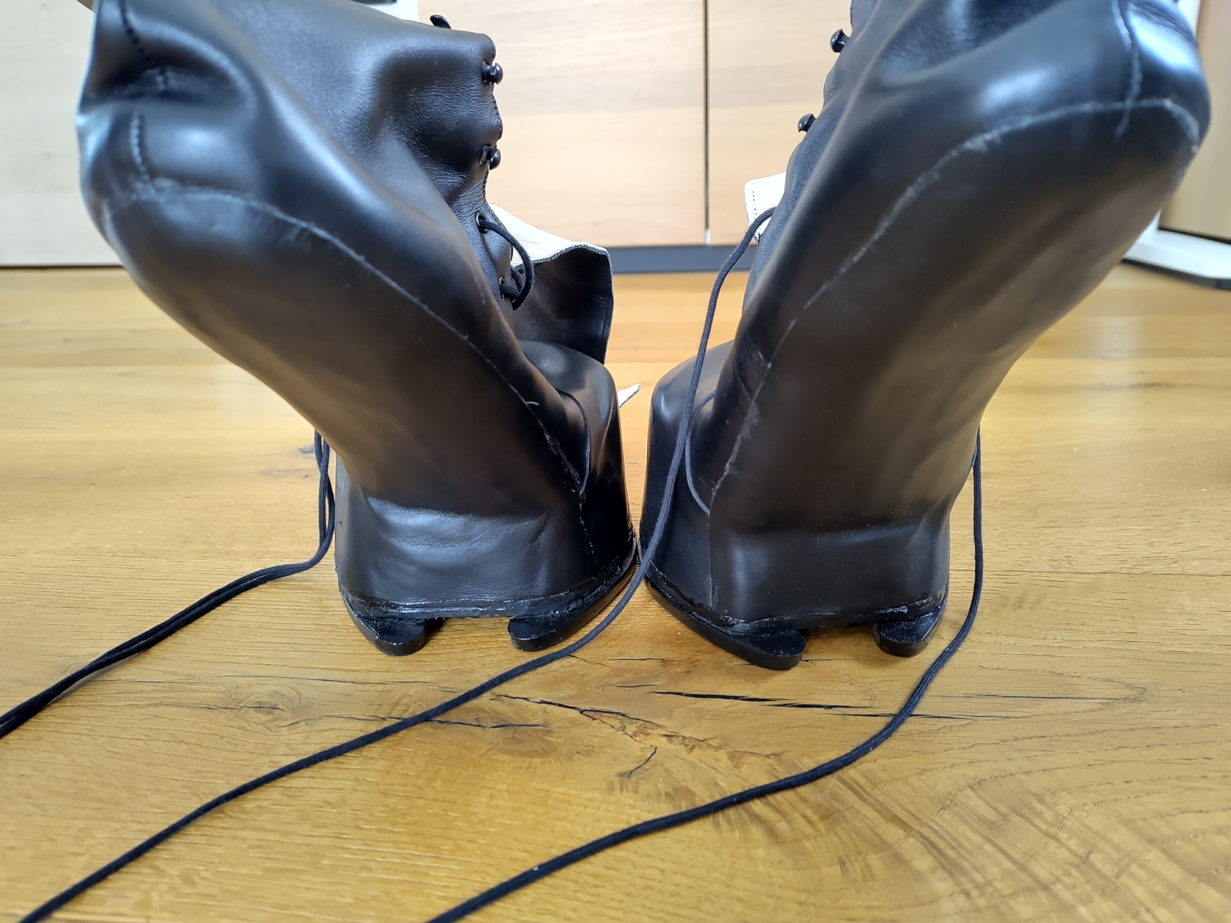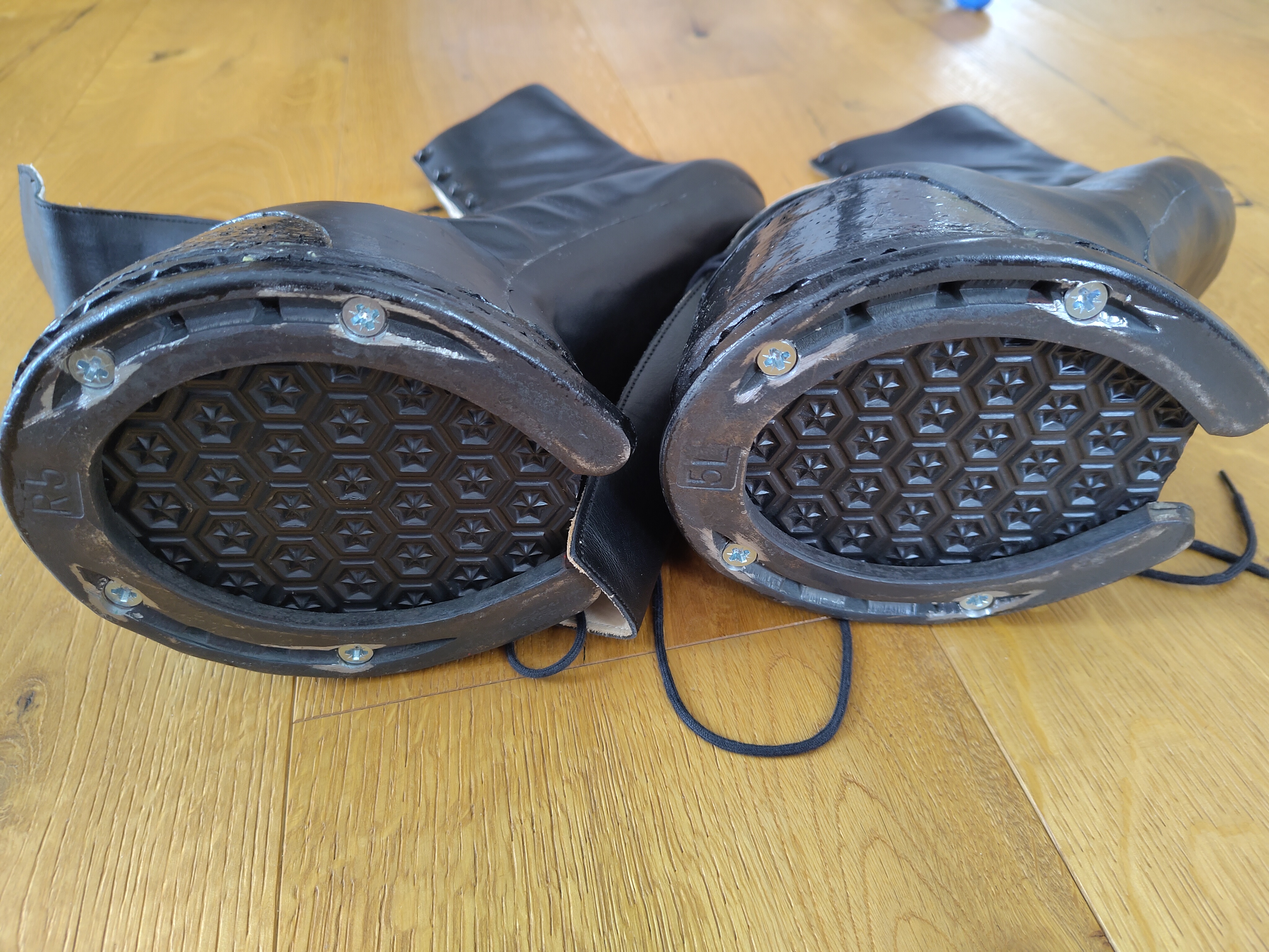 Der Schuh ist mit einem Hufeisen bespannt und gibt dadurch auf hartem Untergrund das typische Geräusch. Man kann das Hufeisen aber auch abnehmen und den Schuh mit Gummisohle verwenden.